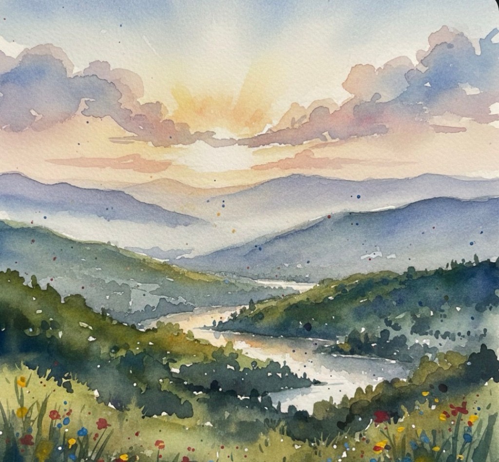 É mais que manhã; é mais uma eternidadezinha se desdobrando, absolutamente incrível, de um jeito que a gente nem sabe se inventa ou se só presencia. O sol, ele não nasce: ele se desfaz em ouro e neblina por sobre os morros, de repente, feito milagre que a gente já esperava, mas que espanta de novo.